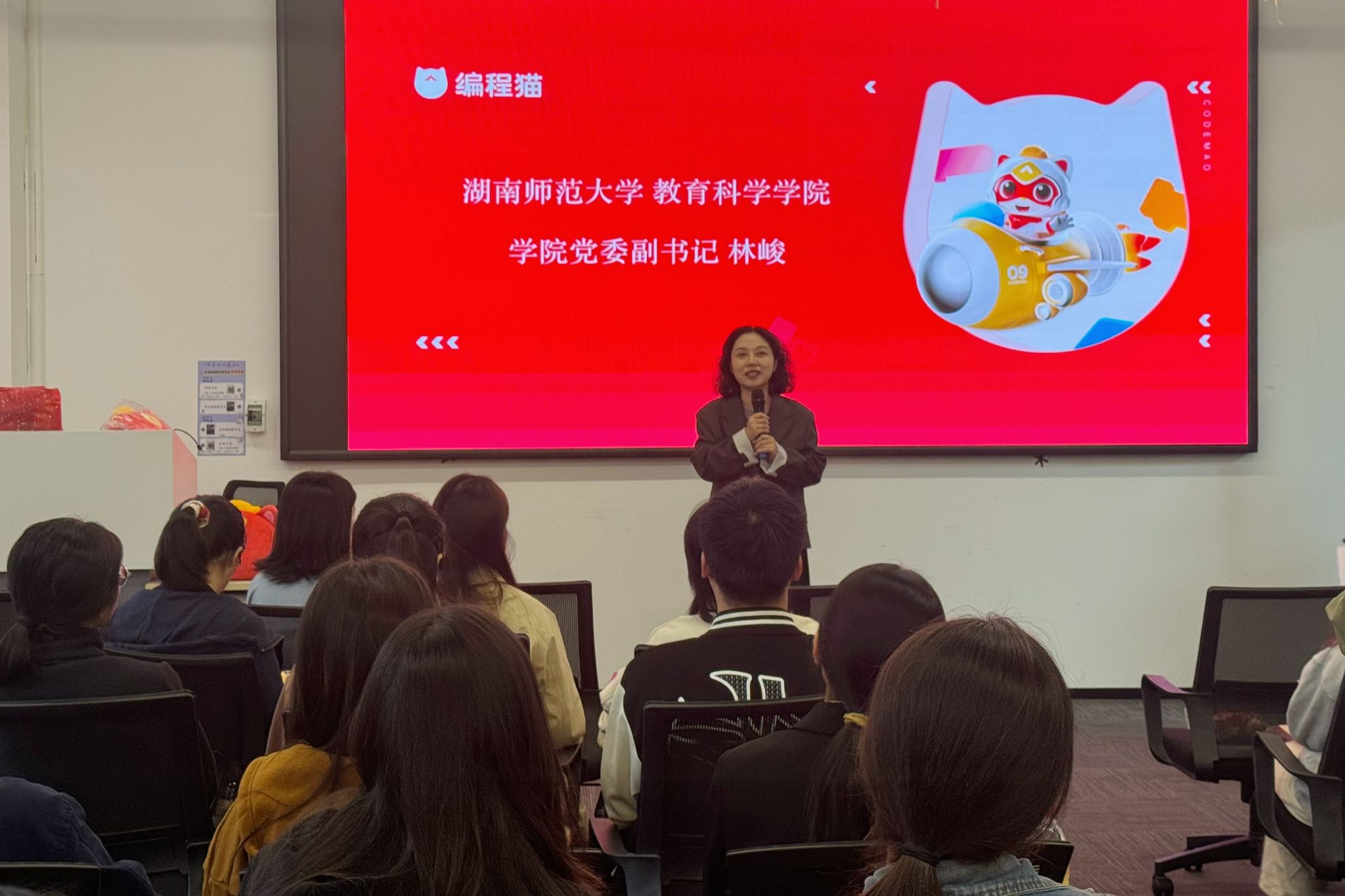 点猫科技首席运营官梁志华发表致辞,她热烈欢迎教科院师生的到来,同时介绍了编程猫登顶“2025全球顶尖教育科技企业”榜单的强大实力。她认为,教科院的人才培养理念和学科专业设置与编程猫的招聘需求高度匹配,并向与会学子发出了招聘邀请。