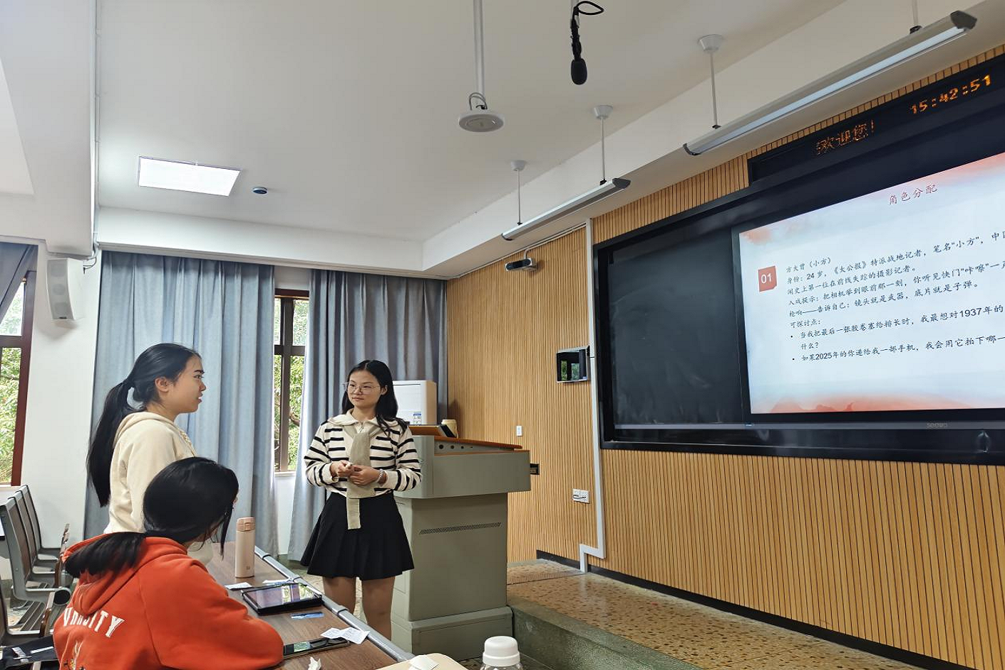 活动伊始,主持人介绍了影片的背景和角色,随后小组成员们通过抽取“方大曾”“抗日排长”等剧中角色身份卡,以沉浸式体验的方式走进那段烽火岁月。观看完影片后,同学们各自从自己角色视角和自身视角分享感悟,并相互探讨体会。