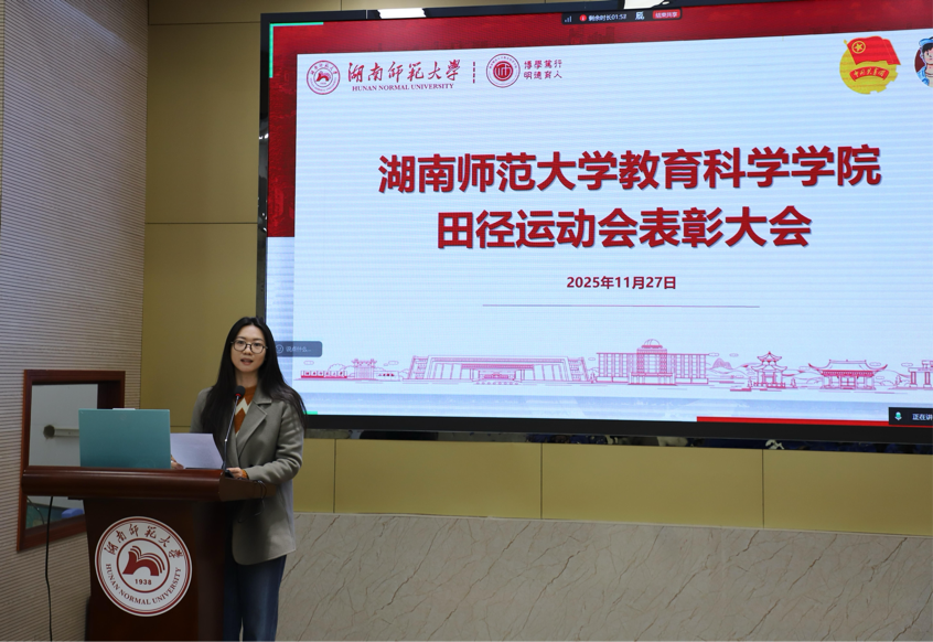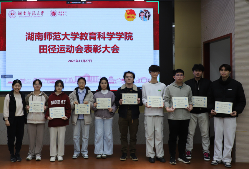(通讯员 廖璟君 俞海翔 尹佳怡)为弘扬体育精神,表彰我院在校运会中表现优异的运动员,11月27日中午,湖南师范大学教育科学学院(以下简称“教科院”)在101教室隆重举行2025年校运会表彰大会。学院学工办主任李雯婕、团委书记谭梦、辅导员吴凡以及运动员代表共同参加。