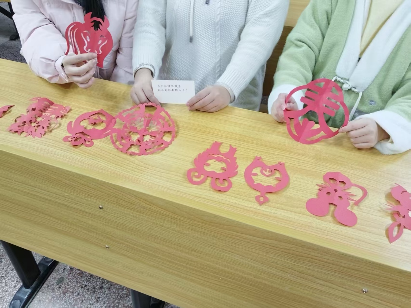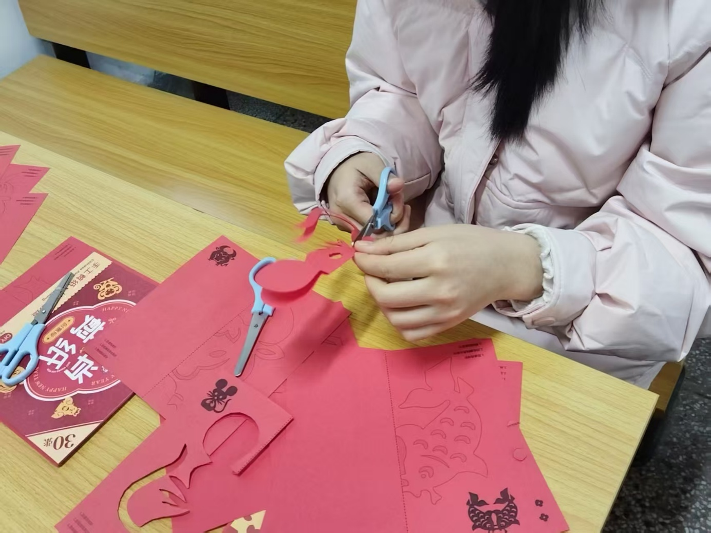 活动现场,剪纸、彩纸与空白贺卡被分发给每位参与者。同学们围桌而坐,或对照纹样细心裁剪,或自由创作个性图案,随后将精致的剪纸作品贴于贺卡封面,并在卡内写下对师长、朋友的暖心寄语。