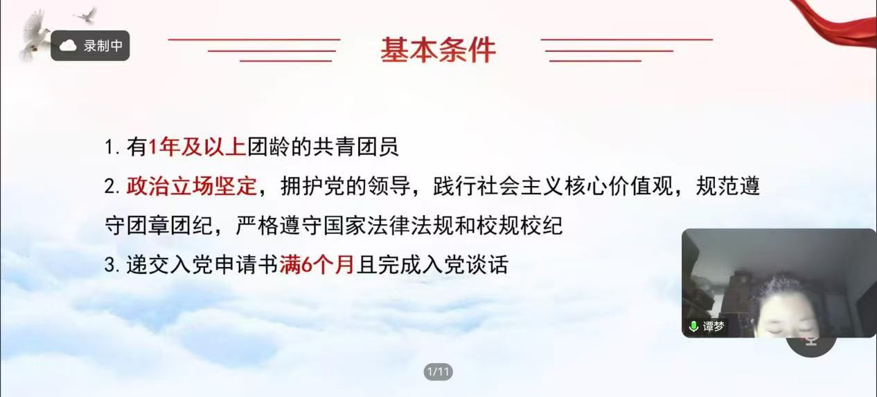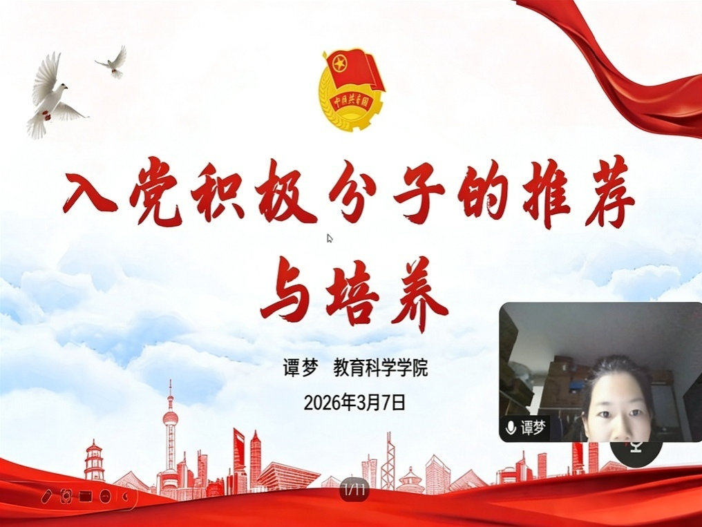 (通讯员 李婉娟 付莹)为进一步规范入党积极分子推荐与培养工作,明确团支部推优标准与工作流程,3月7日晚,教育科学学院通过线上会议形式开展“入党积极分子推荐与培养工作”微团课,院团委书记谭梦担任主讲人。