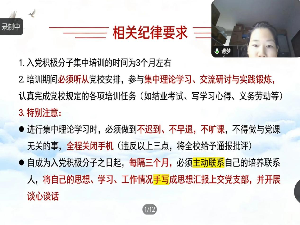 会上,谭梦围绕入党积极分子推荐的基本条件、团支部推荐流程、投票规则及组织纪律等进行系统讲解,明确了团龄、入党申请及谈话等基本要求及先进性考察要求,对团员推优的组织流程、票数统计与填报等环节做出具体部署。谭梦重点强调了成为入党积极分子后,参与党校培训、定期主动进行思想汇报等纪律要求,并在互动环节中解答了相关提问。