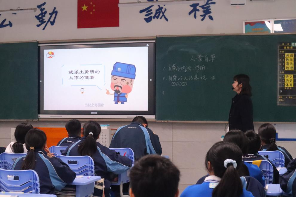 课堂以“人贵自尊”为主题,围绕“知自尊内涵”“知自尊特质”“尊重他人,从心出发”三个递进式教学环节展开。尹灿以志愿者案例导入课题,结合学生生活体验与教材核心素材,讲解自尊的内涵、重要性及核心特质。课中环节,她设置了多个生活化情境,引导学生主动思考、积极发言。