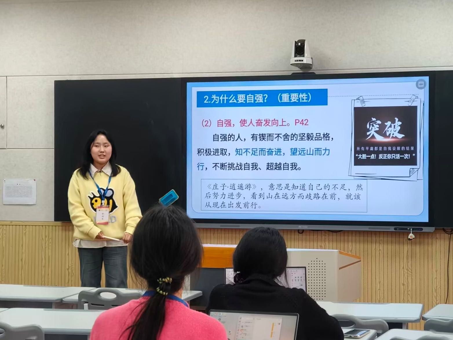 (通讯员 尹佳怡 杨玉婷)4月1日下午,明德天心实习队初一组开展《人生当自强》备课试讲活动,旨在打磨教学流程、提升教学能力。此次活动由我院实习队6名成员参与,明德天心中学初一组指导老师杨菲、杨敏进行点评指导。