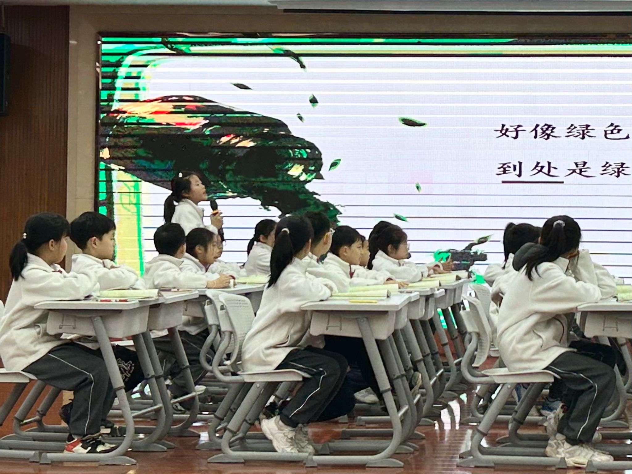 本次教研课由四年级组语文老师邹甜执教,授课内容为现代诗《绿》。邹甜以学生熟知的咏绿古诗导入,聚焦文本核心问题展开探究,遵循由表及里、由景入情的教学逻辑,引导学生逐层解读诗人眼中之绿、心中之绿、生命之绿,把握诗歌意象特点与情感内涵。课堂以问题驱动思辨,以学生为主体开展品读感悟与仿写实践,彰显诗性美育与课堂思辨相融合的教学理念。