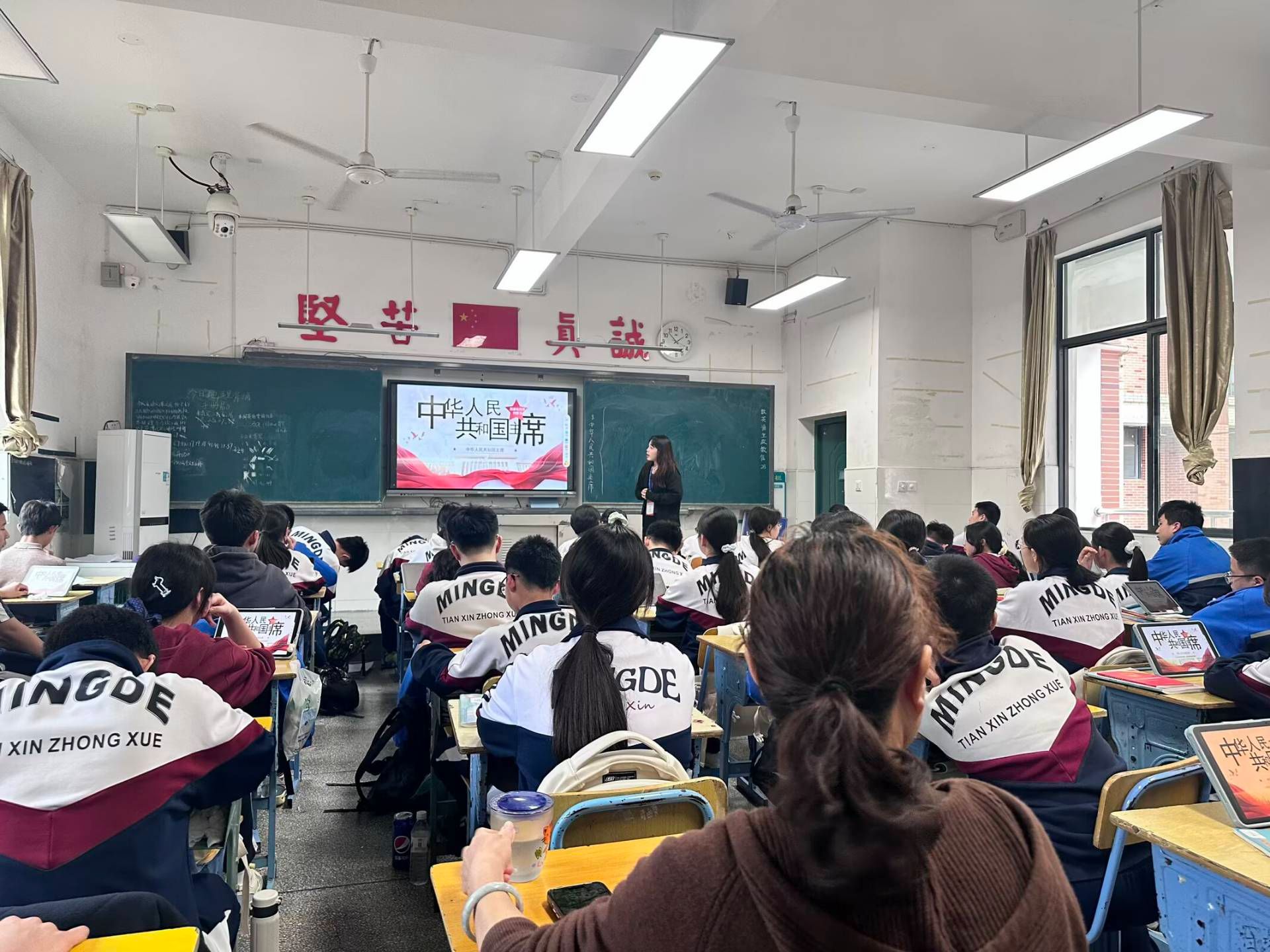 为保障授课顺利开展,四位实习生在学科指导老师的指导下,提前一周开展备课工作,内部开展试讲与磨课,对课堂导入设计、师生互动环节等教学内容进行反复打磨。授课中,四位实习生分别在不同班级同步授课。课堂以习近平当选国家主席时政视频为导入,通过学生抢答形式突破教学重难点,梳理国家主席四大职权,最后开展当堂巩固与课程总结,教学流程完整、节奏安排有序。