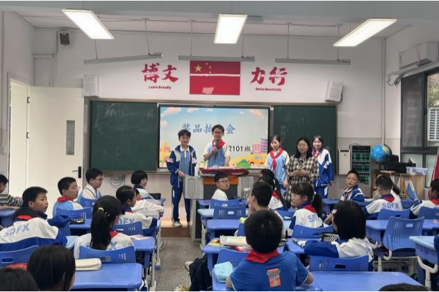 (通讯员 庹明霞 彭晓宇 刘丽)4月10日下午,教育科学学院赴湖南师范大学附属小学(以下简称师大附小)实习队协助五年级2101班举办奖品拍卖会。活动由班主任蒋扬玲组织,实习队队员刘丽、庹明霞协作组织,班级学生张嘉树、金世林、陈绎年主持,柳馨蕾、戴子欣负责奖票审查与核验工作。