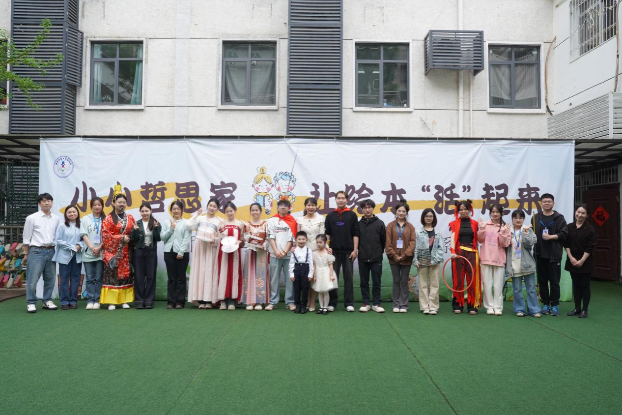 此次阅读节以“小小哲学家,让绘本‘活’起来”为主题,舞台剧《大闹天宫》围绕“自由与规则”的哲学思辨展开,用孩子们熟悉的经典故事,把抽象的哲学思考转化为生动的舞台表演。演出伊始,饰演“自由孙悟空”的实习生手持道具金箍棒登场,其余实习生分别饰演玉皇大帝、“规则孙悟空”、如来佛祖等角色,与化身小猴子的幼儿们,共同呈现了“自由孙悟空”闯蟠桃园、与“规则孙悟空”对峙等核心片段。表演结束后,两位饰演孙悟空的实习生围绕主题进一步与孩子们交流互动。徐惠在活动结束后与实习队队员交流并给予肯定,最后大家合影留念。