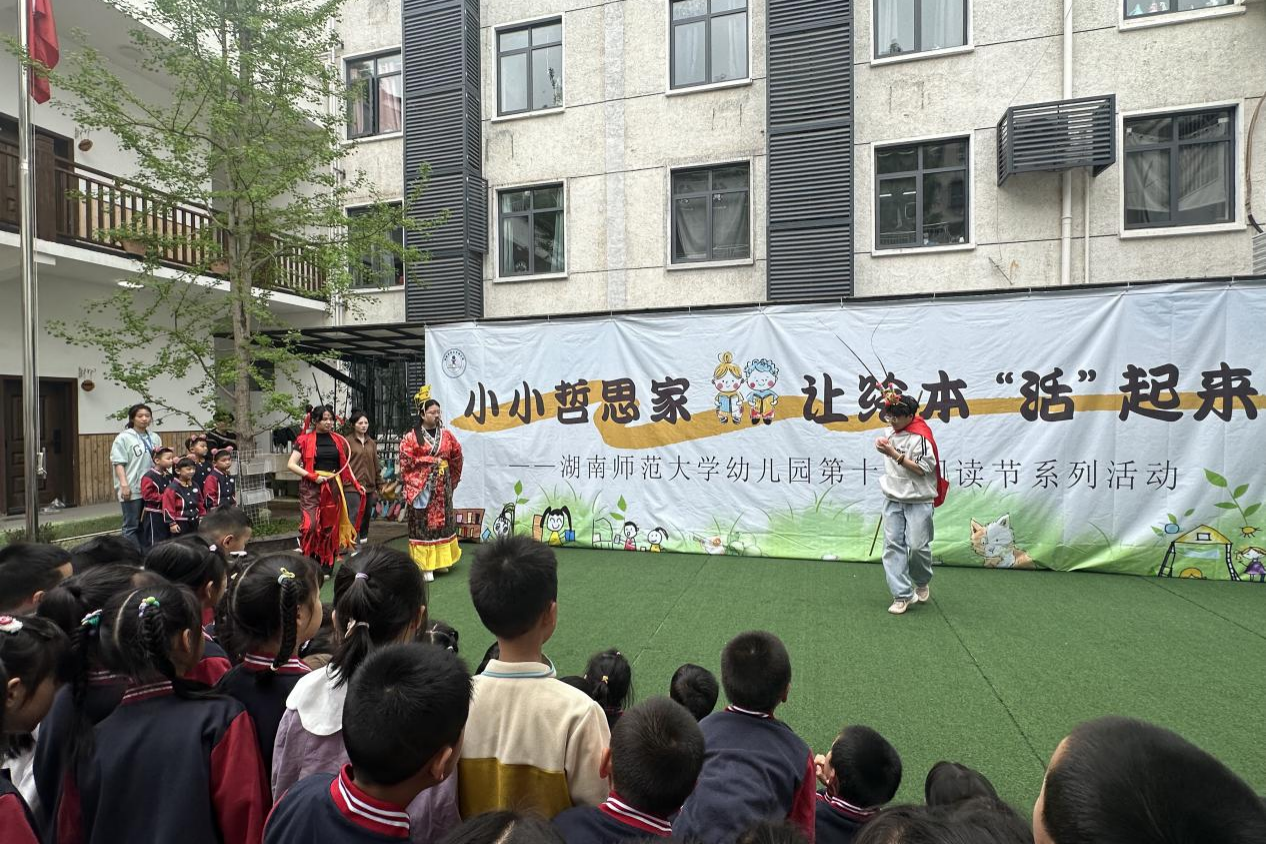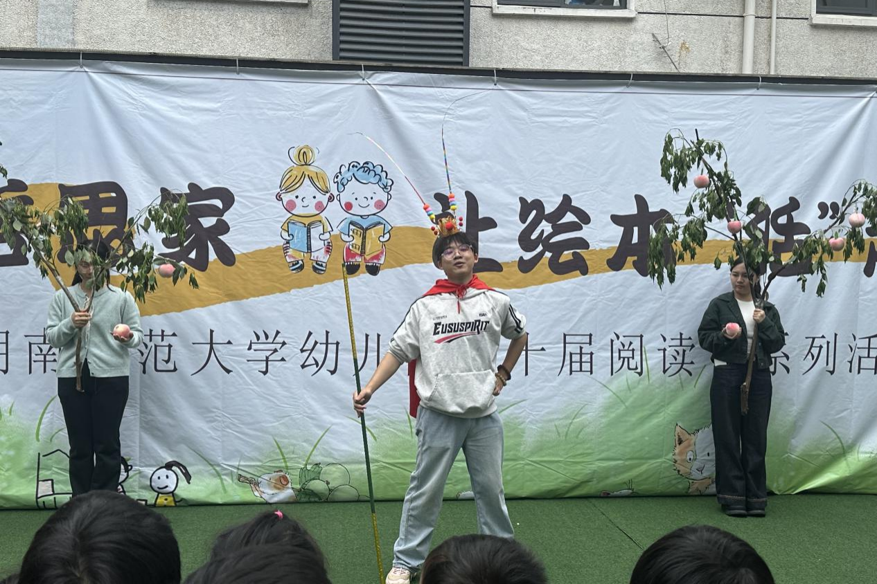 (通讯员 舒娟华 王雨嫣)4月13日上午,教育科学学院赴师大幼儿园实习队在湖南师范大学幼儿园第十届阅读节开幕式上演绎舞台剧《大闹天宫》。实习队全体队员和大班部分幼儿合作演出,园长兼实习领导小组组长徐惠、副园长兼实习领导小组副组长曹怡、园内指导教师郑亚妮和贺艺涵全程参与。