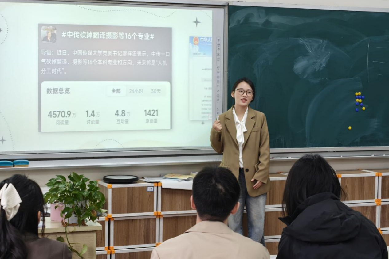 随后,活动聚焦“大学故事”和“拥抱不确定”两个主题展开研讨。谢小婷、马定策结合自身教学经验,详细分享两个主题的备课思路,并向彭健、胡艳、段长英请教备课过程中遇到的疑惑。老师们结合中学生心理特点,为两个主题的备课提供精准化指导,帮助实习队员明确后续备课的重点与方向。