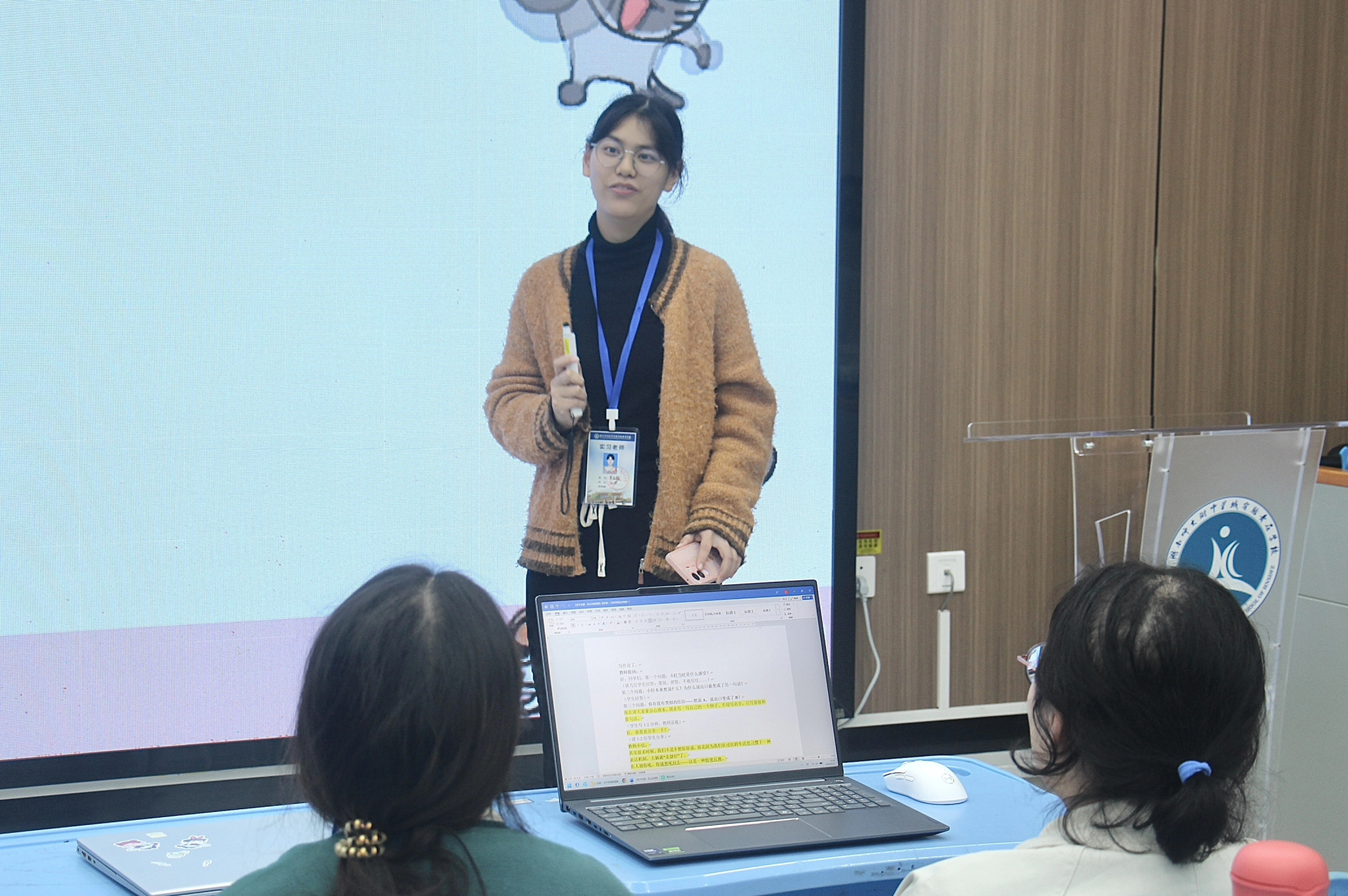 活动伊始,实习教师们在指导老师的组织下进行集体试讲。8名实习教师分别以“编织友谊丝带”“跟非黑即白说‘不’”“亲子沟通,怎么说很重要”“我们与恶的距离”为主题,模拟真实上课情境,教态自然、语言流畅,完成了完整的教学过程展示。