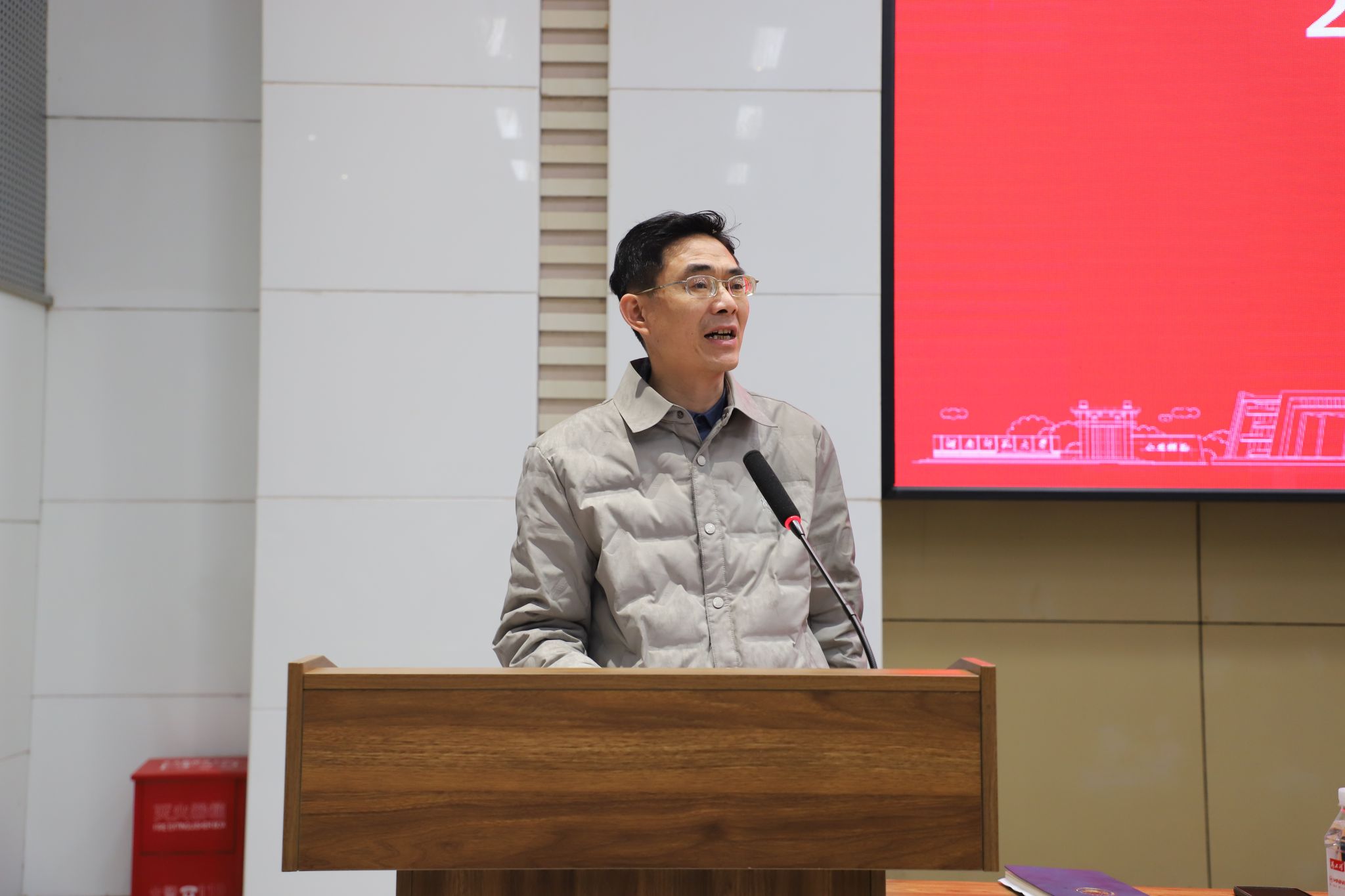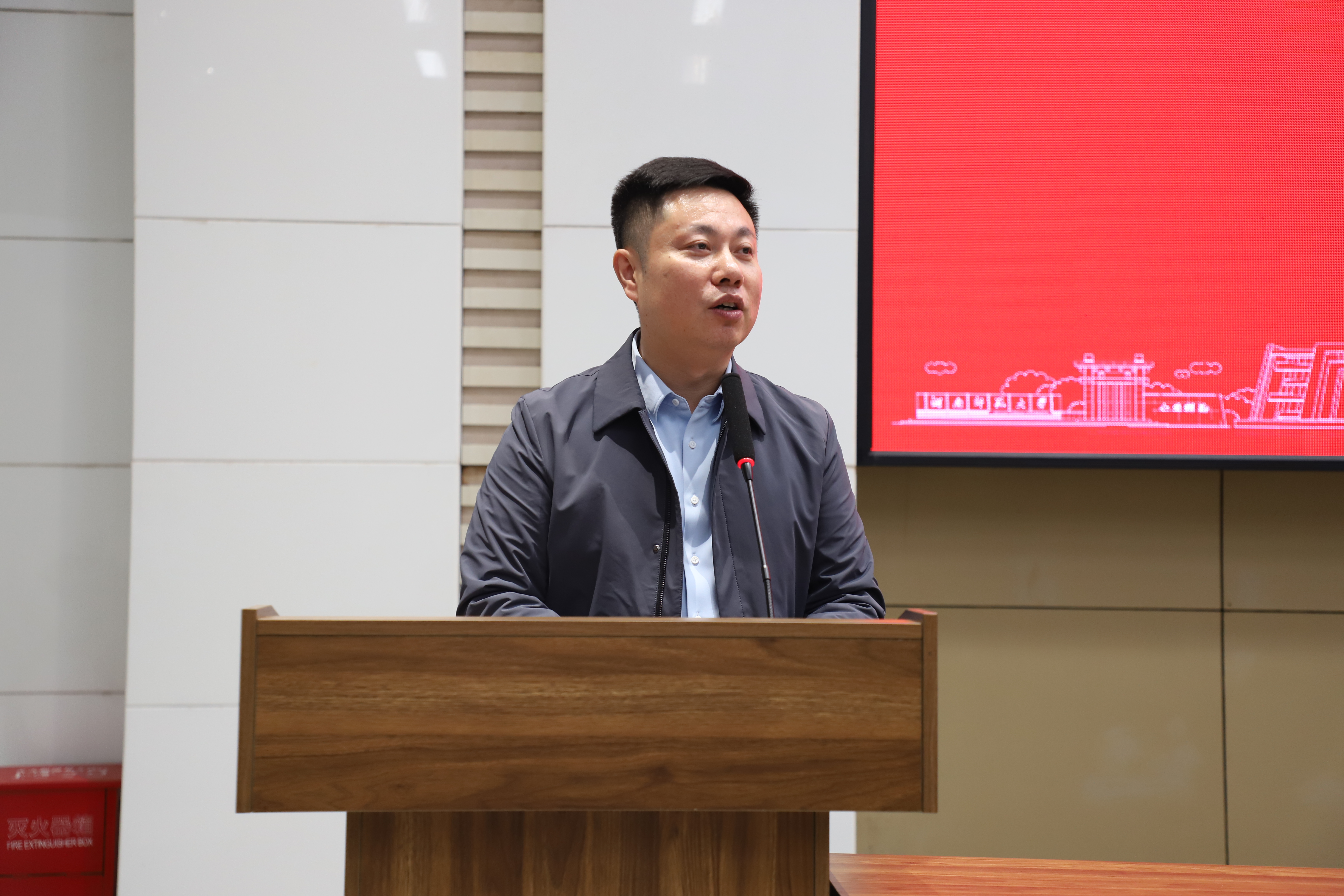 指导教师代表罗建国发言,他表示全体实习生应转变角色、知行合一,虚心求教、互帮互助,严守规章,展现良好风貌。
